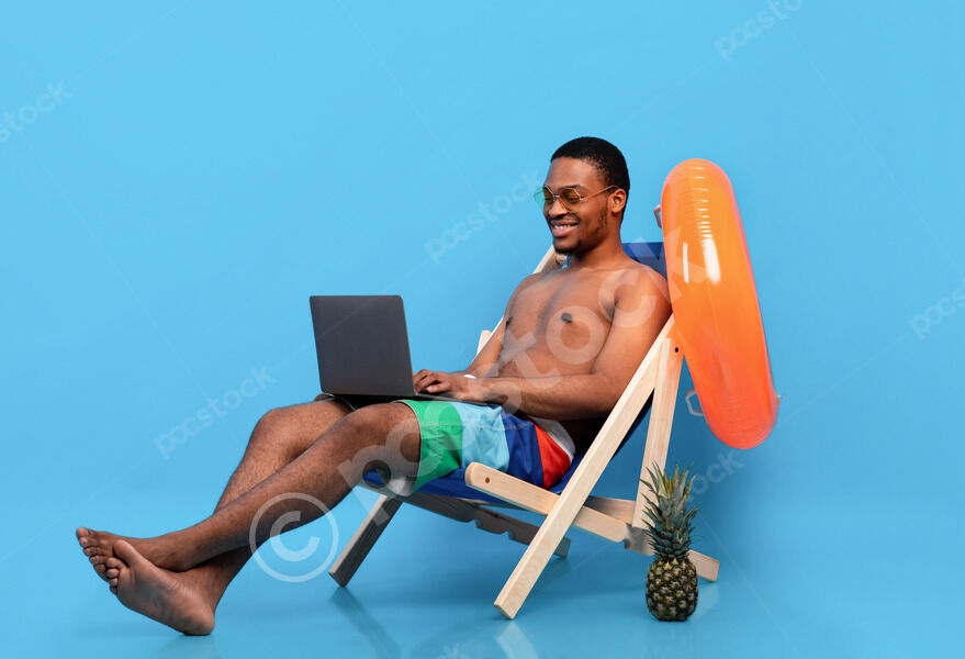 Smiling Black man wearing sunglasses working on laptop sitting on lounge chair with inflatable ring against blue background in studio