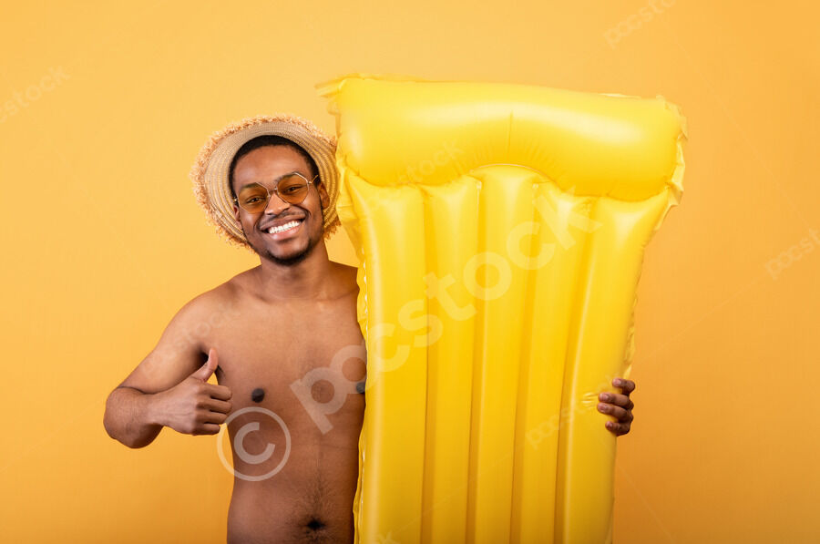 Smiling Black man wearing straw hat doing thumbs up holding inflatable standing against yellow background in studio