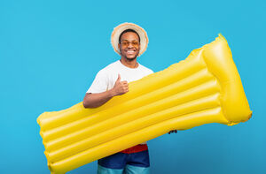 Black man wearing sunglasses and straw hat doing thumbs up with inflatable behind standing against yellow background in studio