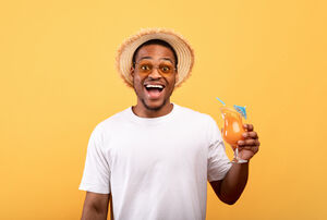 Black man wearing straw hat and sunglasses holding glass of tropical cocktail standing against yellow background in studio