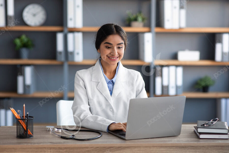 Indian female doctor using laptop while sitting at table with stethoscope in office clinic