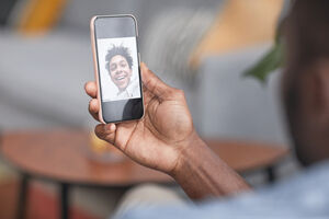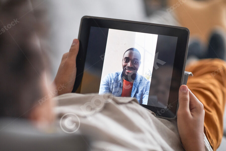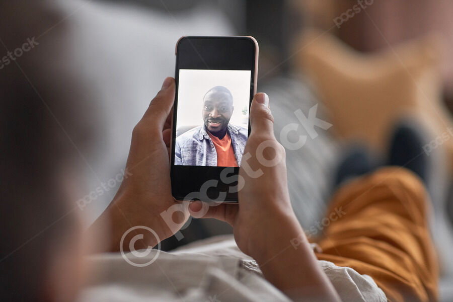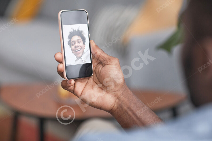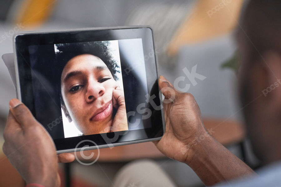 Black man holding smartphone having video call with his son sitting on sofa in living room at home