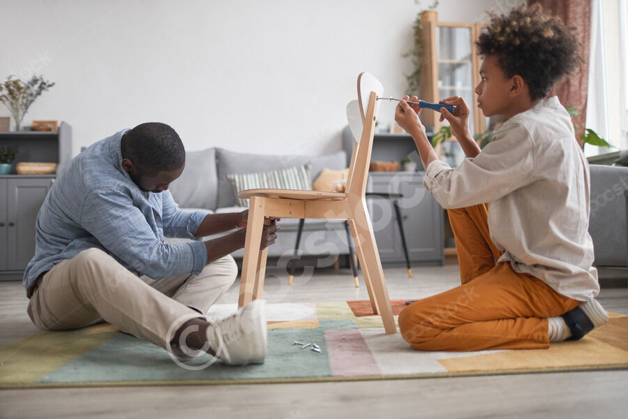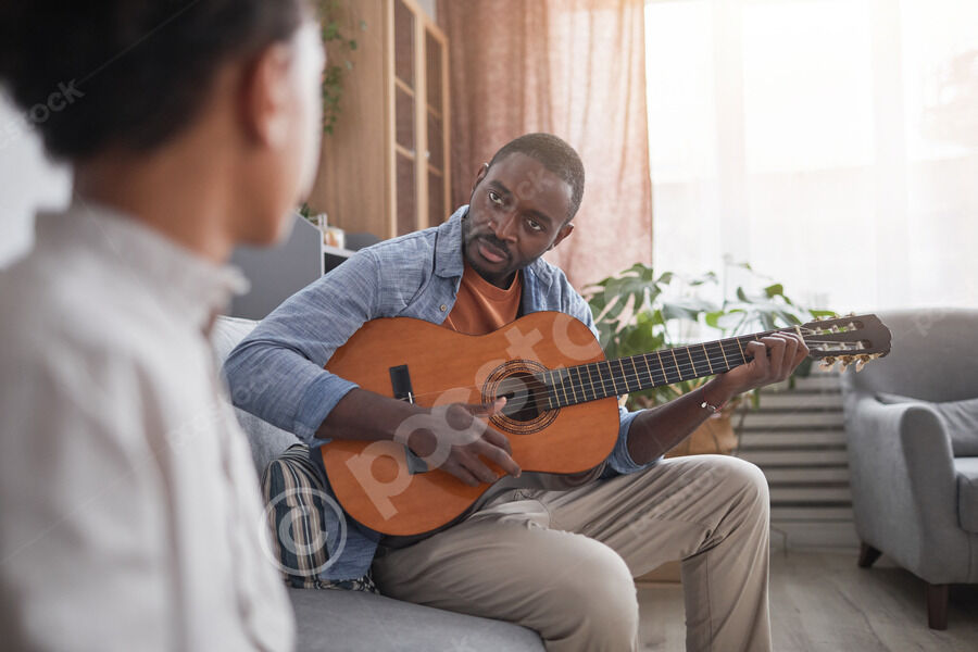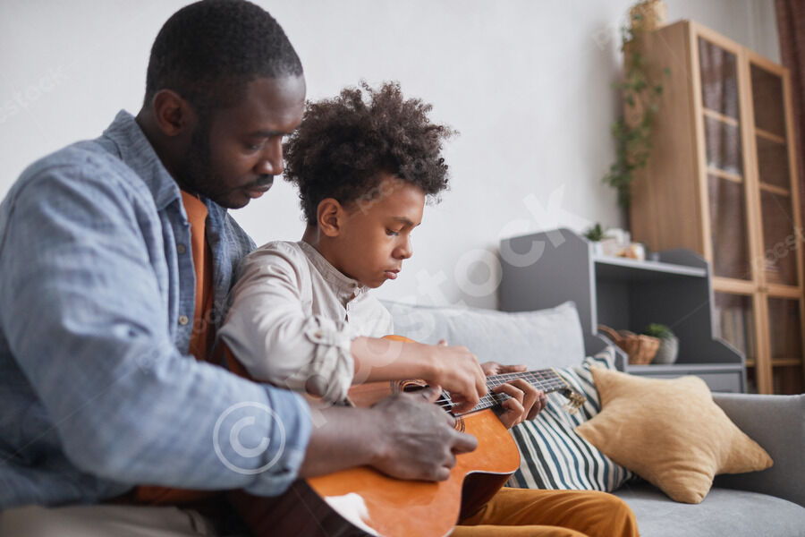 Black father teaching son how to play guitar sitting on sofa in living room at home