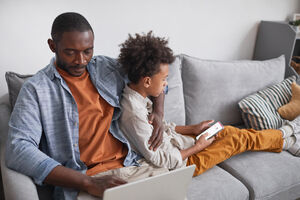 Black father hugging son while using laptop sitting on sofa in living room at home
