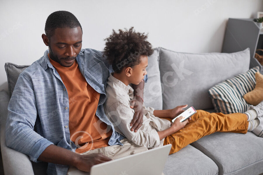 Black father hugging son while using smartphone sitting on sofa in living room at home