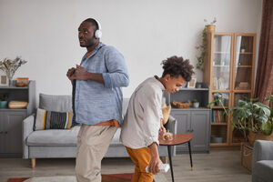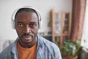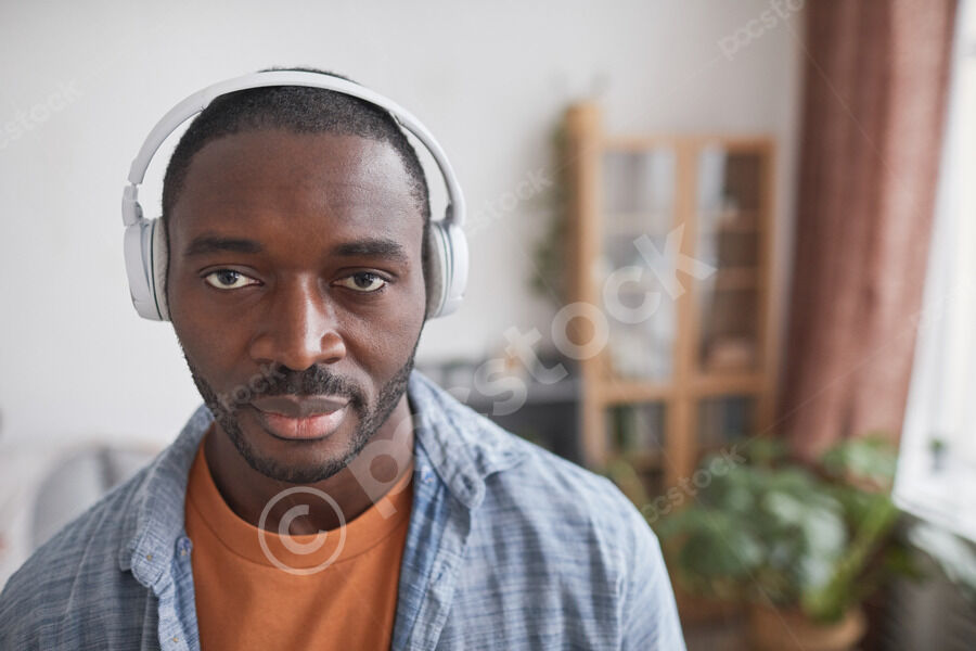 Black man with closed eyes listening to music with headphones dancing in living room at home