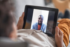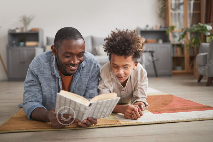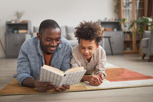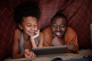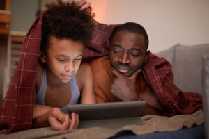 Black father and son watching movie on tablet lying down on bed under checked blanket in bedroom