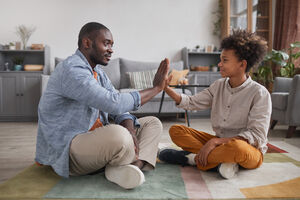 Black father and son playing clapping game sitting with legs crossed on floor in living room at home