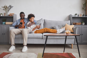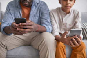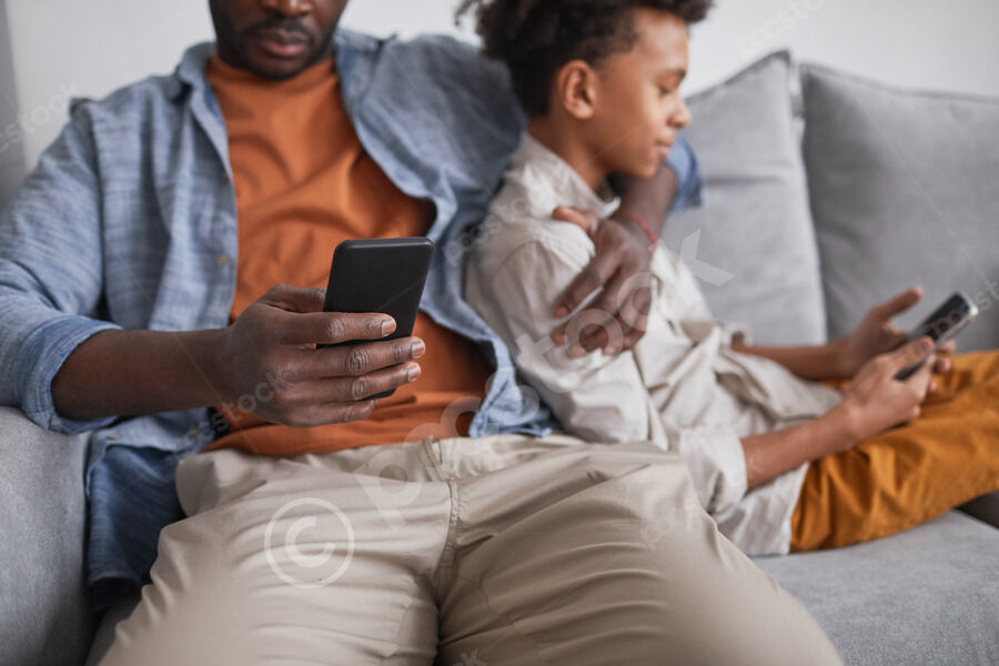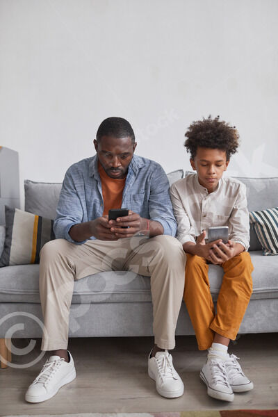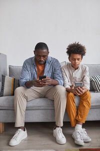 Black father hugging son while using smartphones sitting on sofa in living room at home