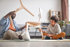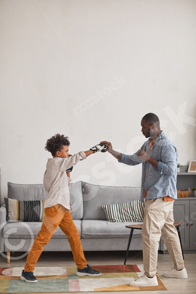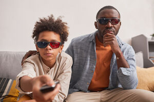 Black boy turning on 3D film using clicker sitting on sofa with father at home