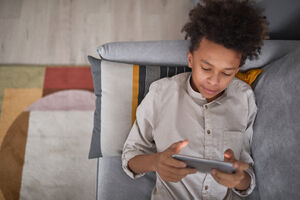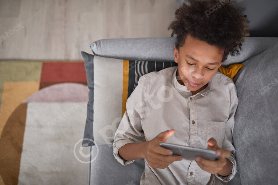 Black male teenager holding controller and playing video games while sitting on sofa in living room at home