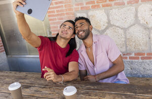 Cheerful mixed-race female medical student sharing smartphone with Black and Hispanic friends having coffee together sitting at table in outdoor cafe during daytime
