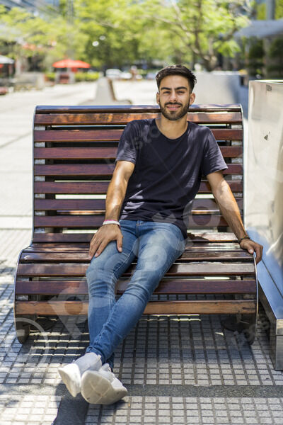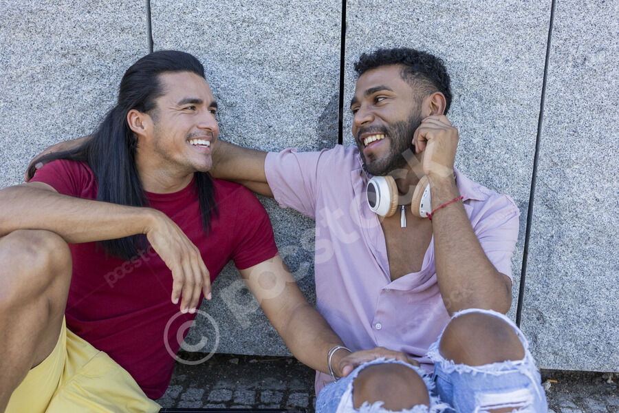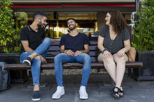 Cheerful mixed-race female and Hispanic male medical students wearing eyeglasses holding folder and laptop sitting with crossed legs on wooden bench on city street during daytime
