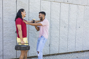 Cheerful mixed-race female and Hispanic male medical students with bags wearing eyeglasses holding folder standing together in university campus during daytime