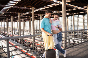Mixed-race female and Hispanic male medical students wearing eyeglasses using laptop holding documents discussing medical information sitting together on wooden bench in city on sunny day