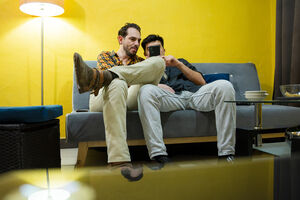 Black teenage boy with cerebral palsy in wheelchair having fun playing with caucasian teacher at home