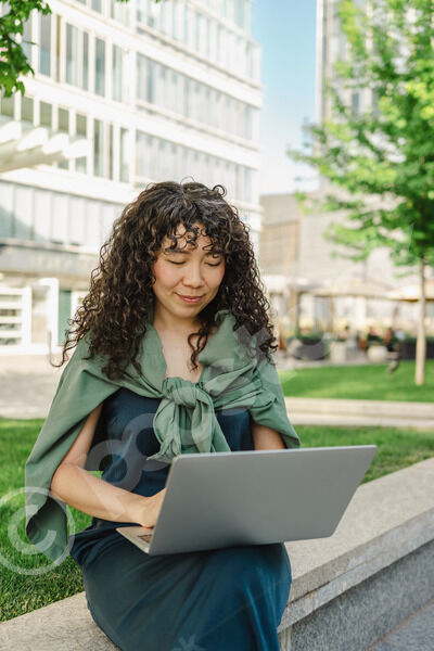 Asian woman with curly hair using laptop while sitting on concrete bench in city on sunny day