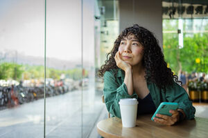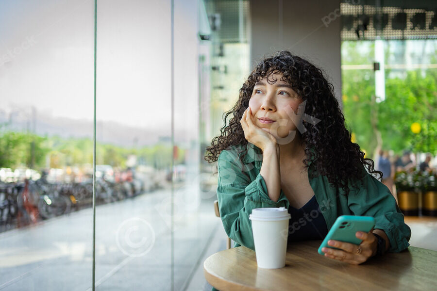 Asian woman with curly hair leaning chin on hand and holding smartphone looking through glass wall while sitting at table with takeaway coffee cup in cafe