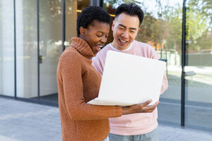 Black woman and caucasian man holding tray of potted flower at plant store during daytime