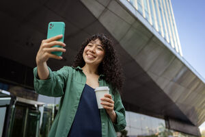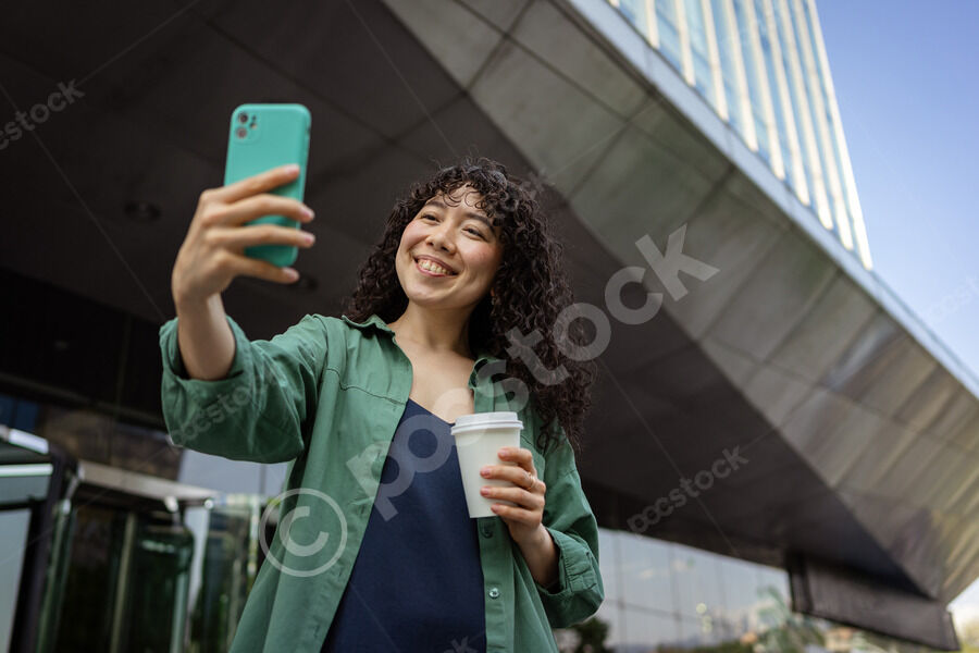 Asian woman with curly hair taking selfie with coffee while standing in city during daytime