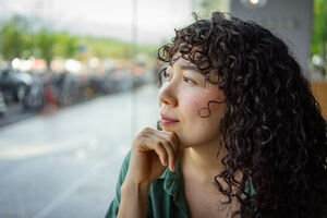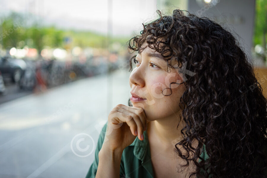Asian woman with curly hair leaning chin on hand and looking through glass wall while sitting in cafe