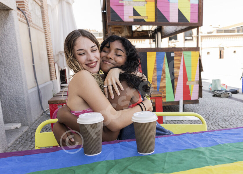 Smiling Hispanic and mixed-race lesbian couple embracing each other while standing on bridge in city during daytime