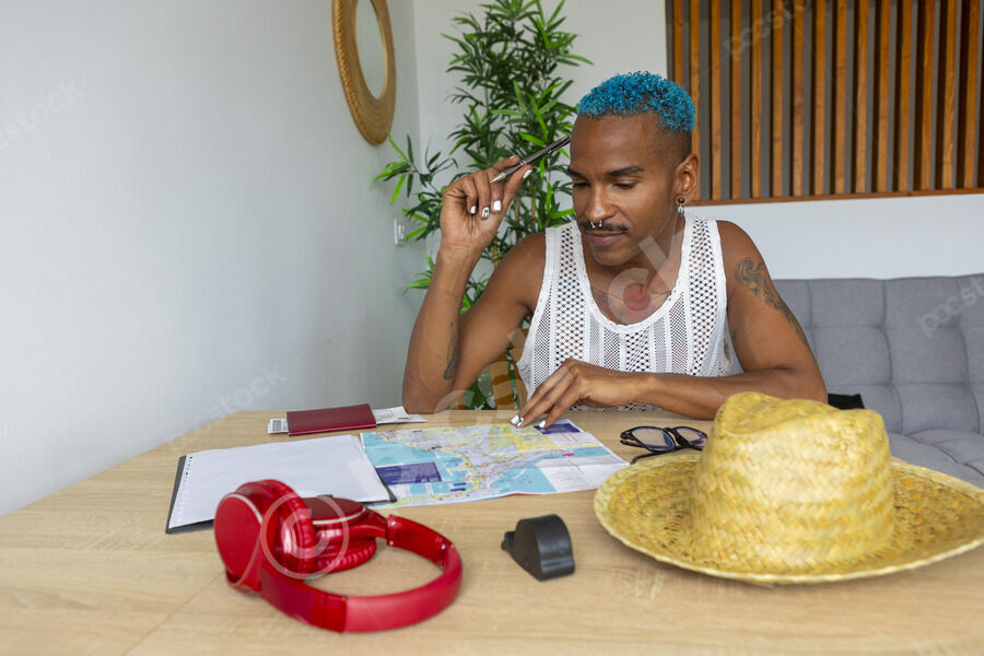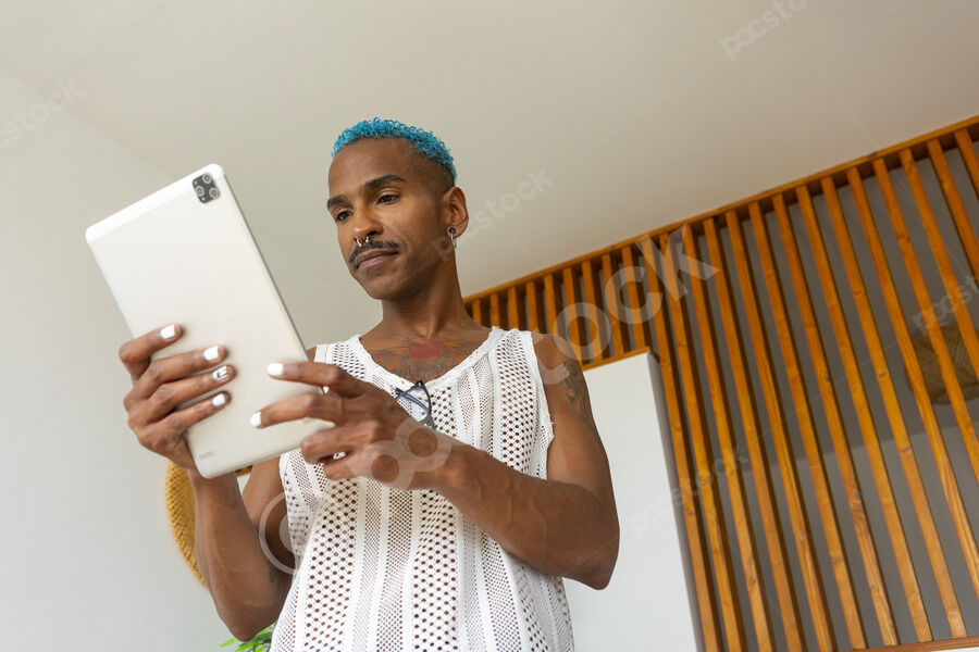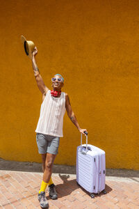 Smiling Black male with dyed hair standing near metal wall on street during daytime