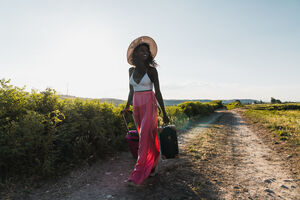 Serious Hispanic woman in active wear with duffle bag standing on wooden path on park