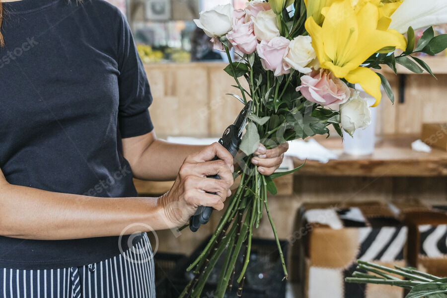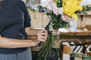 Middle-aged Asian female florist arranging bouquet cutting stems while standing at table in flower shop