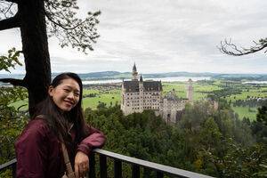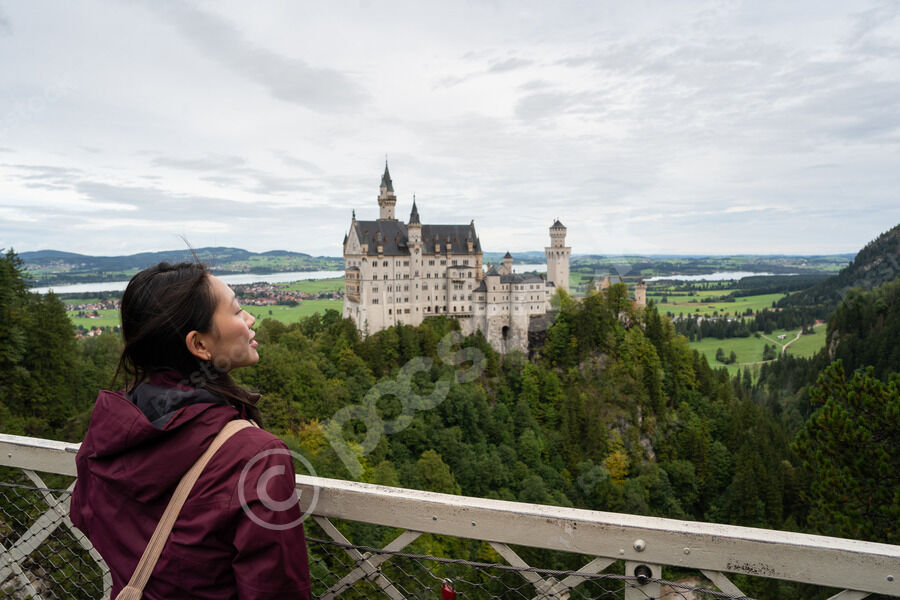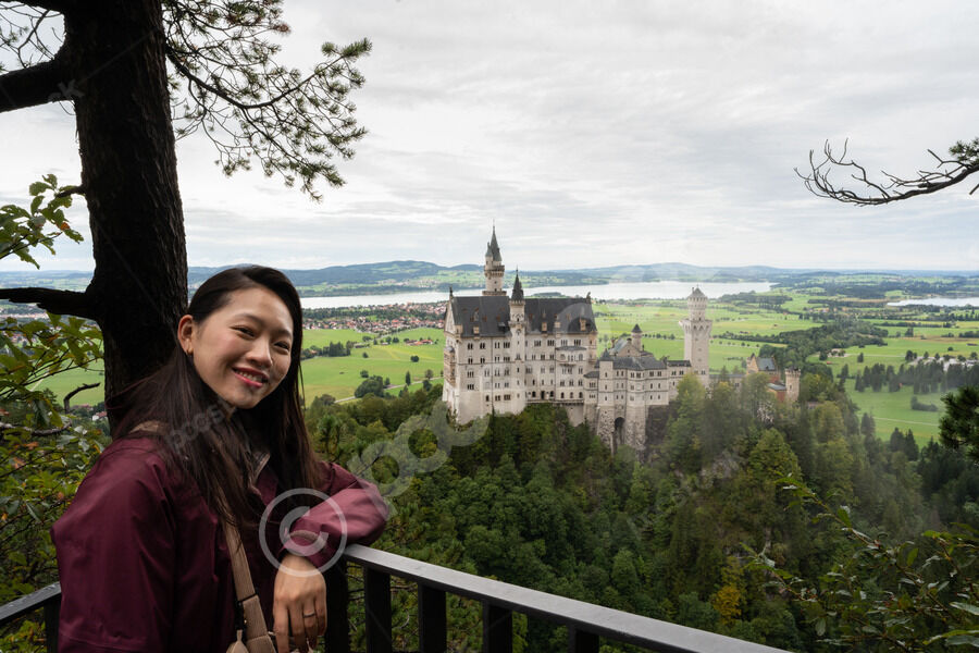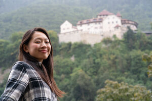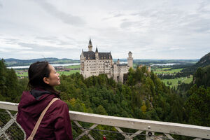 Chinese woman enjoying the view standing on bridge near castle surrounded by lush forests and scenic landscape from an elevated viewpoint