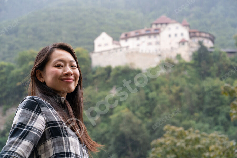 Smiling Chinese woman standing in light rain with castle in the background surrounded by lush greenery
