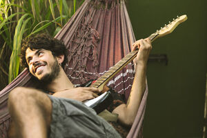 Hispanic man with curly hair and beard playing guitar while lying on hammock in the backyard during daytime