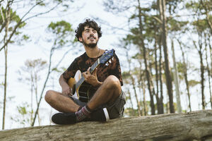 Hispanic man with curly hair and beard playing guitar while sitting on log in forest during daytime