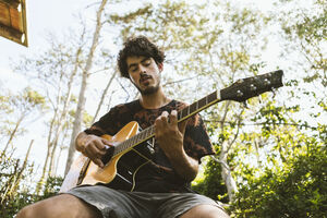 Hispanic man with curly hair and beard playing guitar while sitting in the backyard on summer day