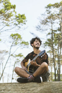 Hispanic man with curly hair and beard playing guitar and looking away while sitting with crossed legs on log in forest during daytime