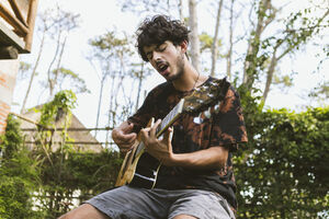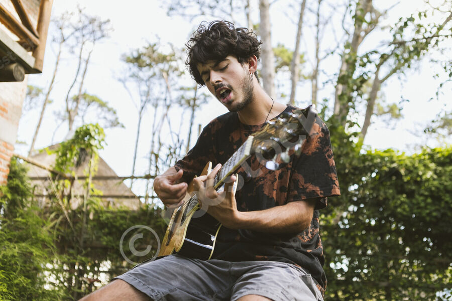 Hispanic man with curly hair and beard playing guitar and singing while sitting in the backyard on summer day