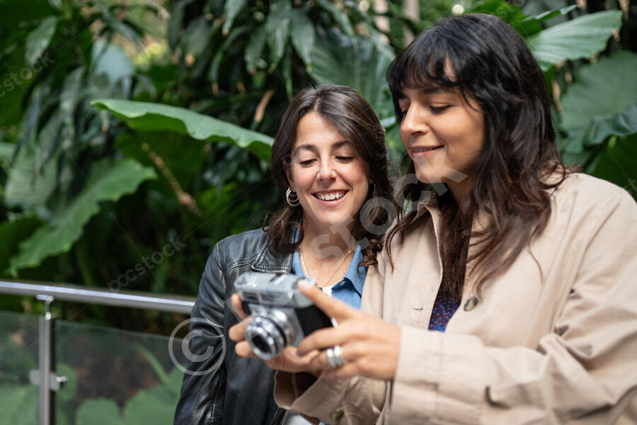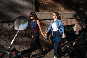 Middle-aged Hispanic gay couple holding hands and looking at each other while going down the stairs in park during daytime