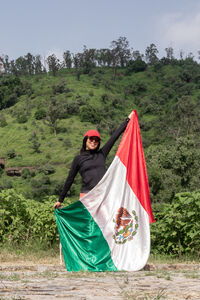 Hispanic woman holding Mexican flag stands amidst mountain during daytime