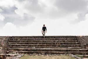 Hispanic man with Mexican flag overlooking archaeological zone under cloudy sky
