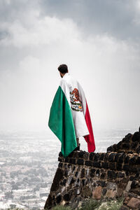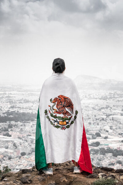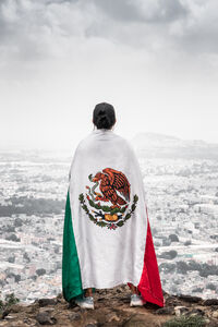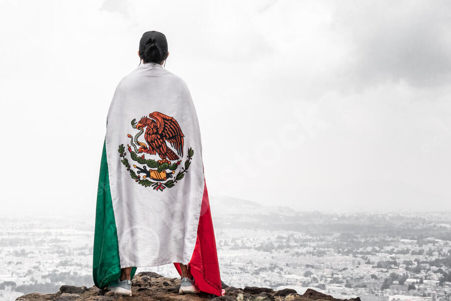 Back view of Hispanic woman with Mexican flag draped gazing over cityscape