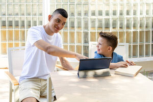 Hispanic young man with cerebral palsy and mild deafness using tablet with younger brother sitting at table outdoors on sunny day