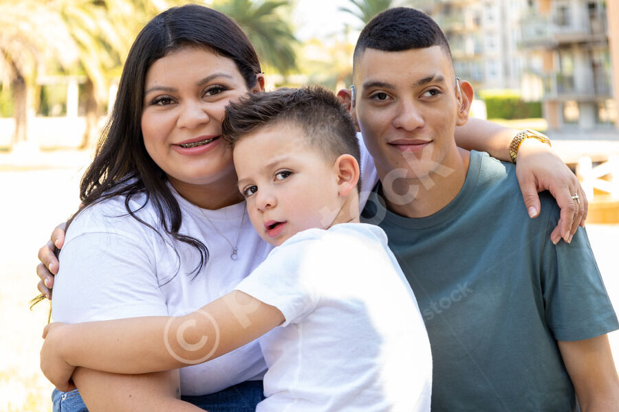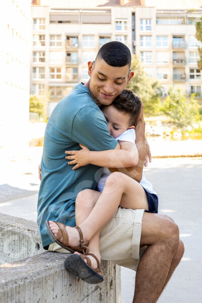 Hispanic young man with cerebral palsy and mild deafness hugging younger brother on bench in park on sunny day