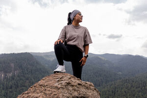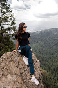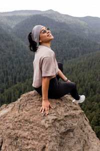Hispanic female hiker wearing sunglasses looking away sitting on rugged mountaintop surrounded by dense forest during daytime