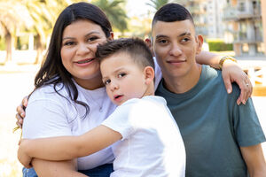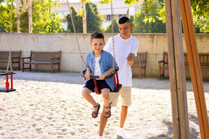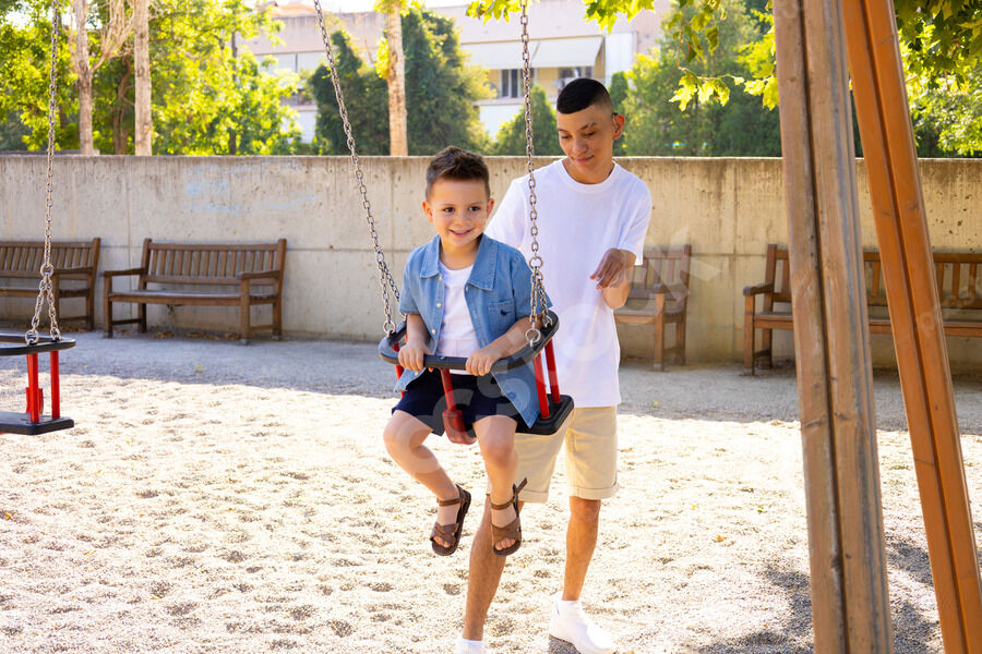 Hispanic young man with disabilities assists younger brother on swing in park on sunny day