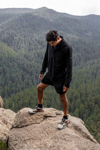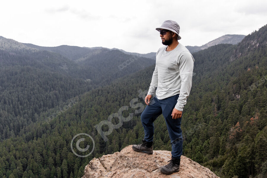 Hispanic male hiker looking downwards standing on rock with lush forest backdrop during daytime