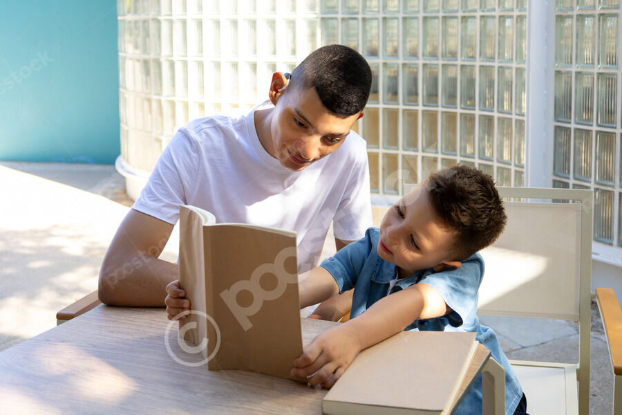 Hispanic young man with disabilities reading book with younger brother sitting at table outdoors on sunny day