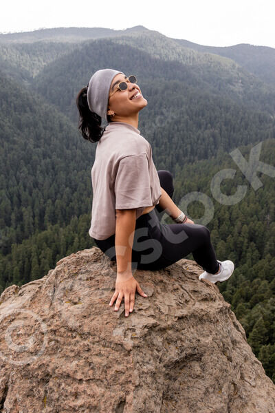 Hispanic female hiker sitting on top of rocky peak against lush mountain backdrop during daytime