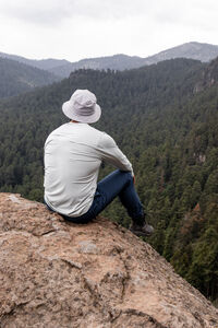 Back view of male hiker in hat and shirt sitting on rocky ledge overlooking vast forest during daytime