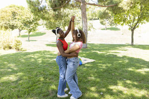 Black lesbian couple wearing headphones listening to music while dancing together with holding raised hands in park during daytime