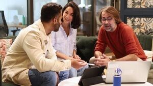 Smiling Black and Hispanic couple standing back to back against blue background in studio